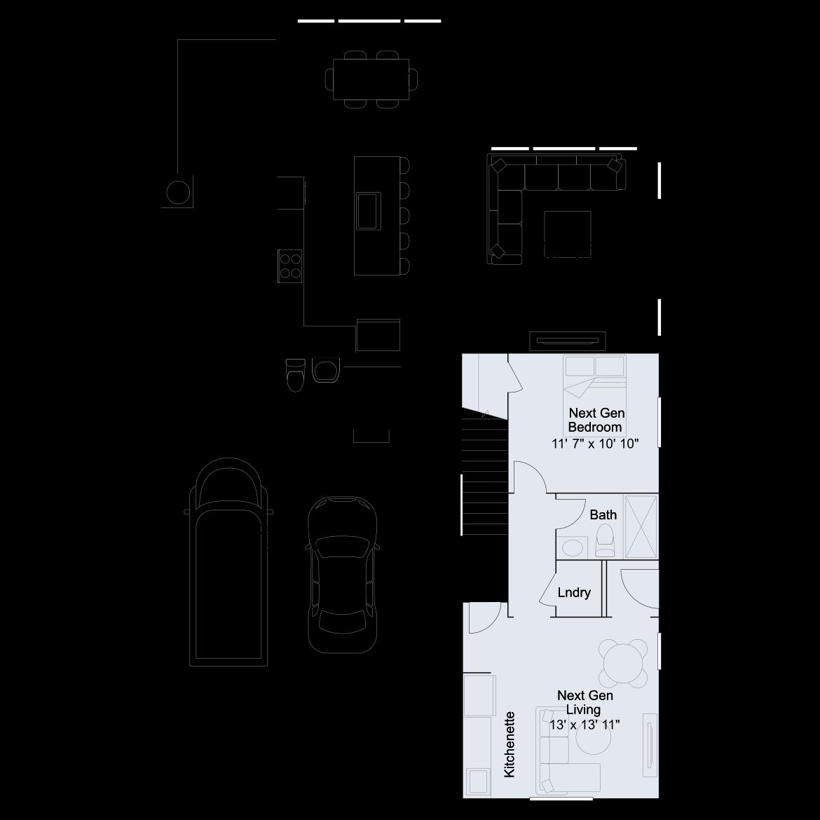 This Next Gen® home features a private suite with a separate entrance, bedroom, kitchenette and living area, ideal for multigenerational households. An open-concept layout on the first floor boasts access to a covered patio for effortless entertaining and multitasking. The owner’s suite and three secondary bedrooms are located upstairs near a spacious and flexible loft.