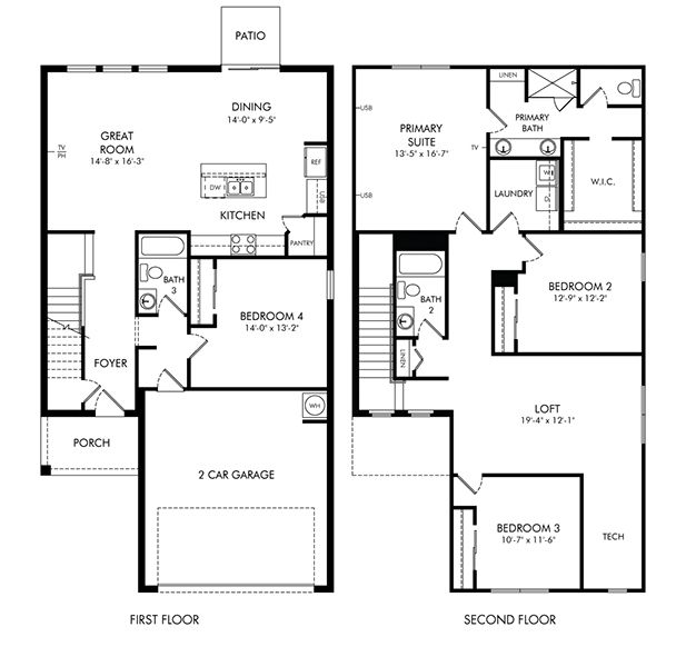 Open first floor creates a unified living space with a large great room that overlooks the kitchen and dining area. Upstairs loft can be used to best fit your family's needs and tech area is perfect for a home office.